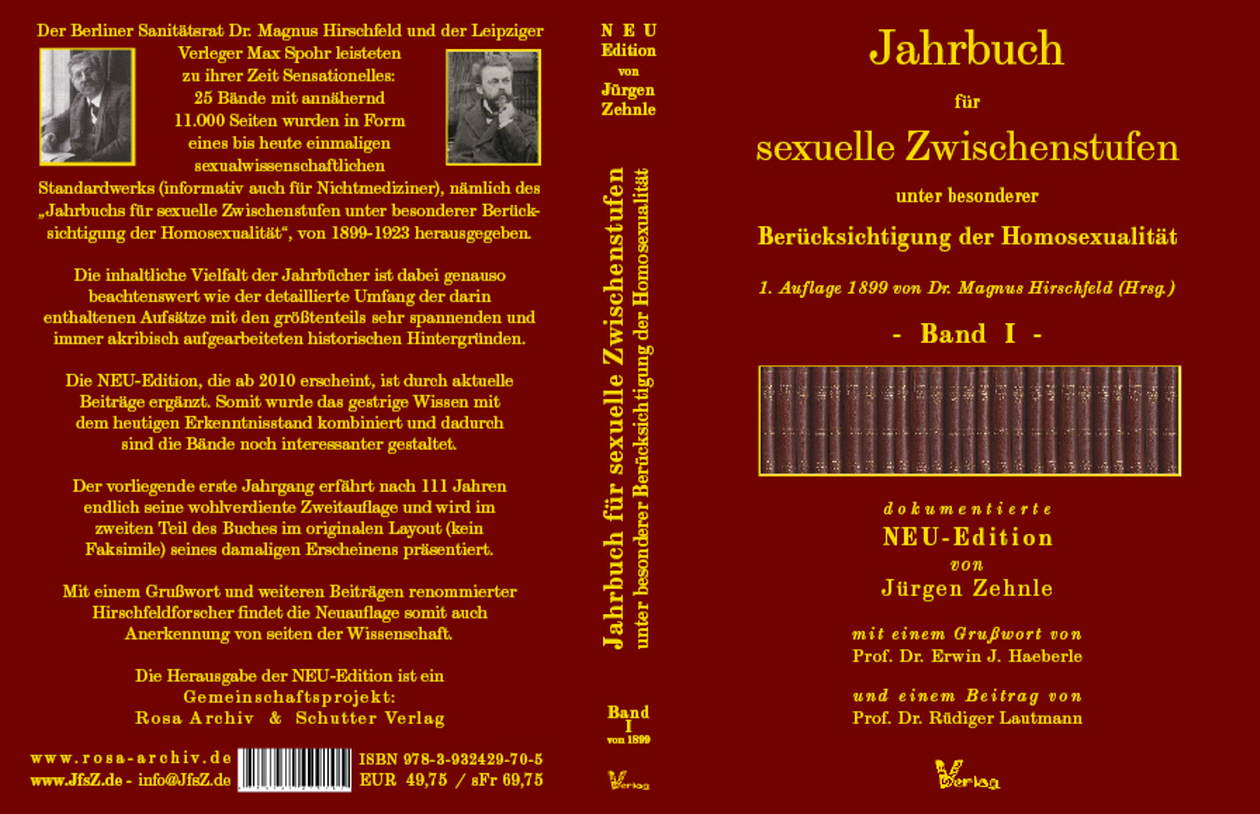 Prof. Dr. Erwin J. Haeberle im Grußwort zum Band I der NEU-Edition: „Das gründliche Studium der alten Bände des ´Jahrbuch für sexuelle Zwischenstufen´ kann aber immer noch ein hilfreicher Einstieg sein, auch für die künftige Forschung. Es wäre zu wünschen, daß es bald einem neuen Hirschfeld gelingt, wieder Mitstreiter zu organisieren, die sich gemeinsam an diese lohnende Arbeit machen.“ |